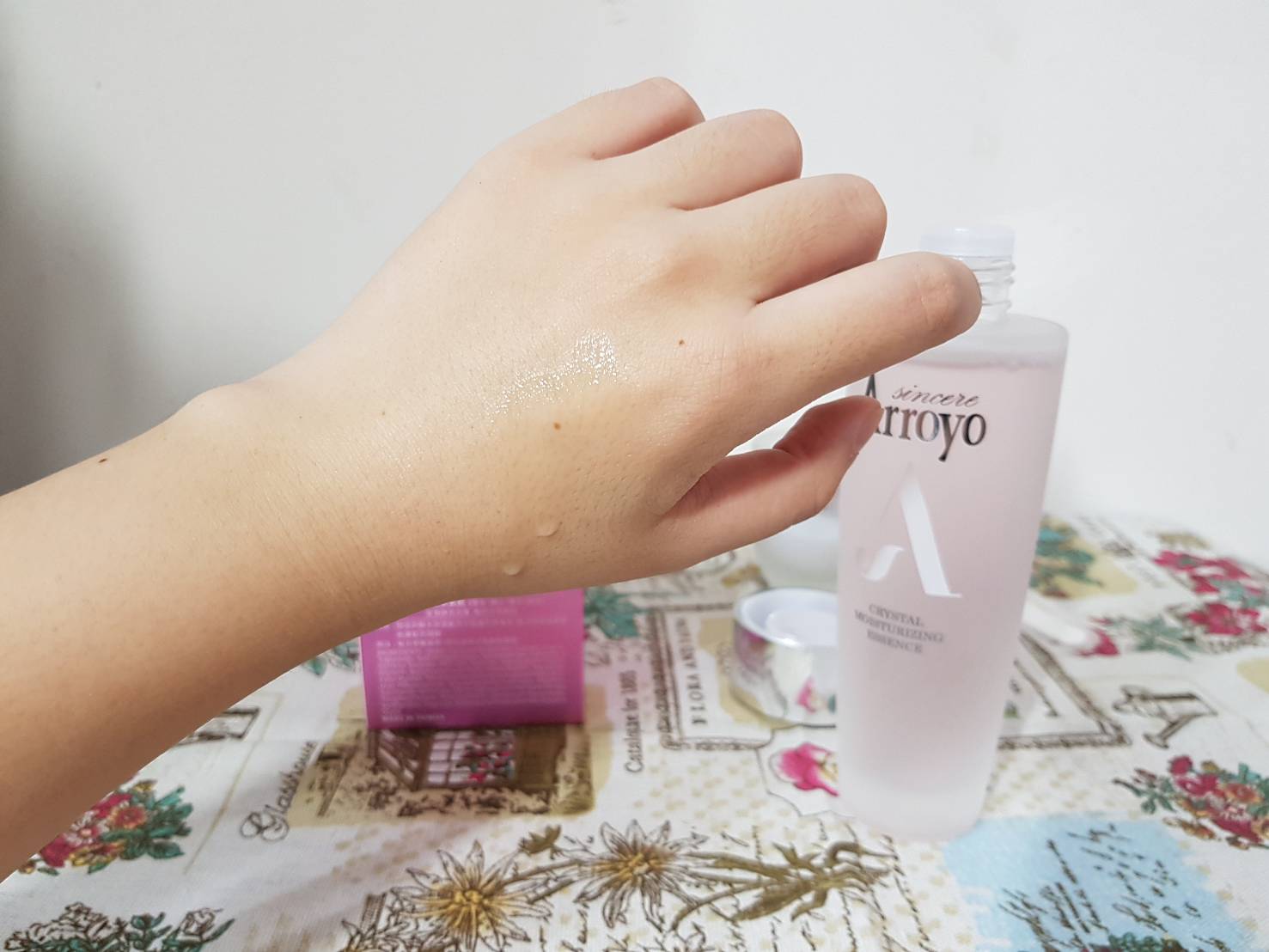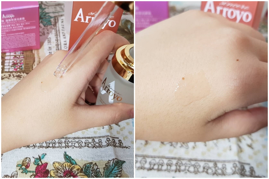 它是有點水凝的稠狀液體,輕輕推即可推勻。使用保濕精華液最容易遇到的問題就是,散失的很快,因此保濕續航力較不夠,而且甚至還會帶走臉上原本的水分,使臉部開始出油,然後大多數人就會誤會自己保濕做過頭了,然後再減少保濕次數或程序,成為一股惡性循環。Arroyo 愛樂優 為了要徹底解決這個問題,使用「特殊間歇是放技術」延長保濕成分停留在肌膚的時間。
