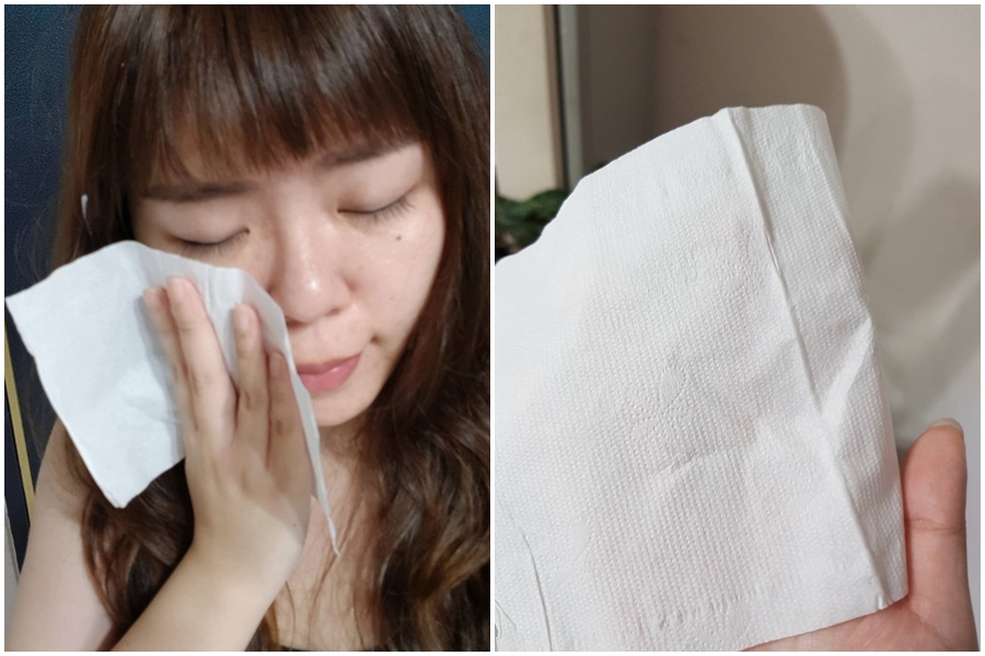 一段時間後再測試,用衛生紙按壓,沒有出油喔!每個女生化妝台上都該有一組。