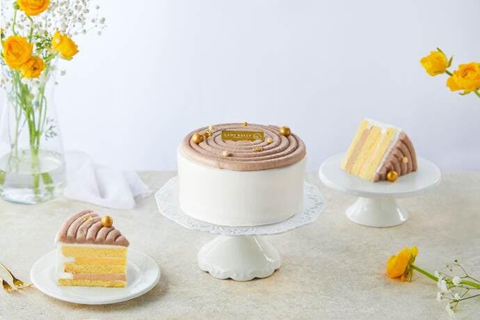 綿密濃郁的芋頭泥以少糖比例配方製作,色調溫暖柔和,一圈圈鋪滿蛋糕頂層後,再用璀璨的金色巧克力脆球和金箔輕輕點綴;內餡搭配Q彈滑嫩手作布丁和溫潤鮮奶油,層層融合、口感純淨自然,就像在時光洪流中逐漸沉澱的少女心,慢慢積累出圓融與柔韌,歲月靜好的感動悄然流瀉。