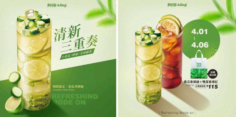 阿檸 a.ling長期以「新鮮檸檬現打」作為品牌核心特色,透過不同茶底與食材搭配,發展出多款檸檬系列飲品。從人氣商品「鴨屎香檸紅」到此次推出的「黃瓜香檸綠」,品牌持續以檸檬作為風味主軸,延伸出更多清爽且具有辨識度的飲品組合。