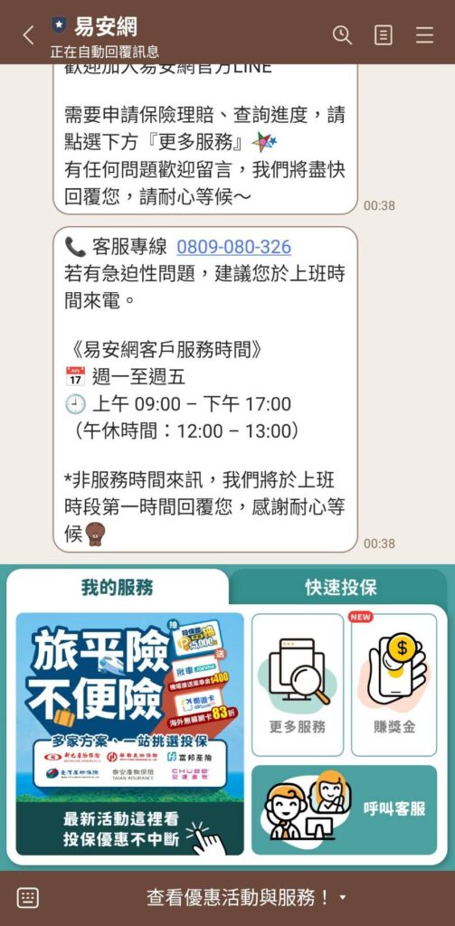 也有LINE官方客服,投保時真的有不懂的可以利用上班時間詢問客服