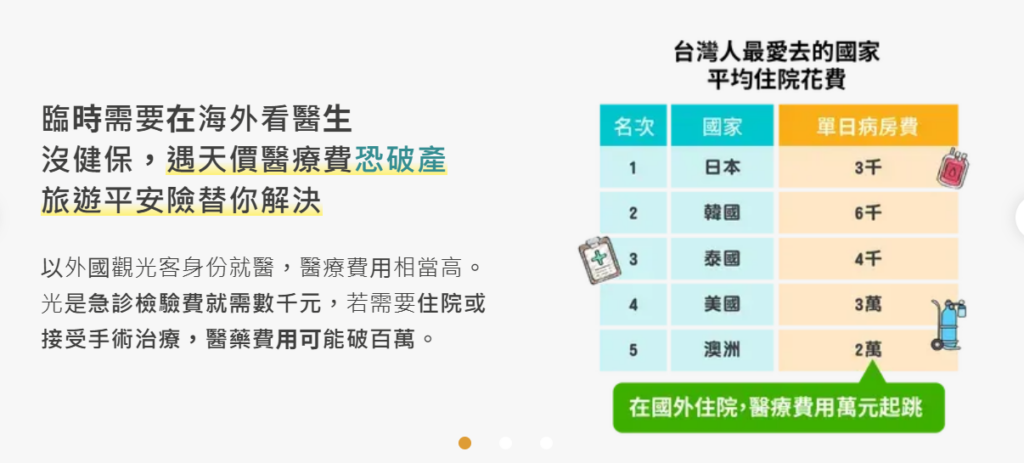 旅平險通常包含「海外突發疾病」的保障,萬一在國外水土不服、食物中毒或突發感冒發燒需要住院,保險能支付相關的門診、急診或住院費用