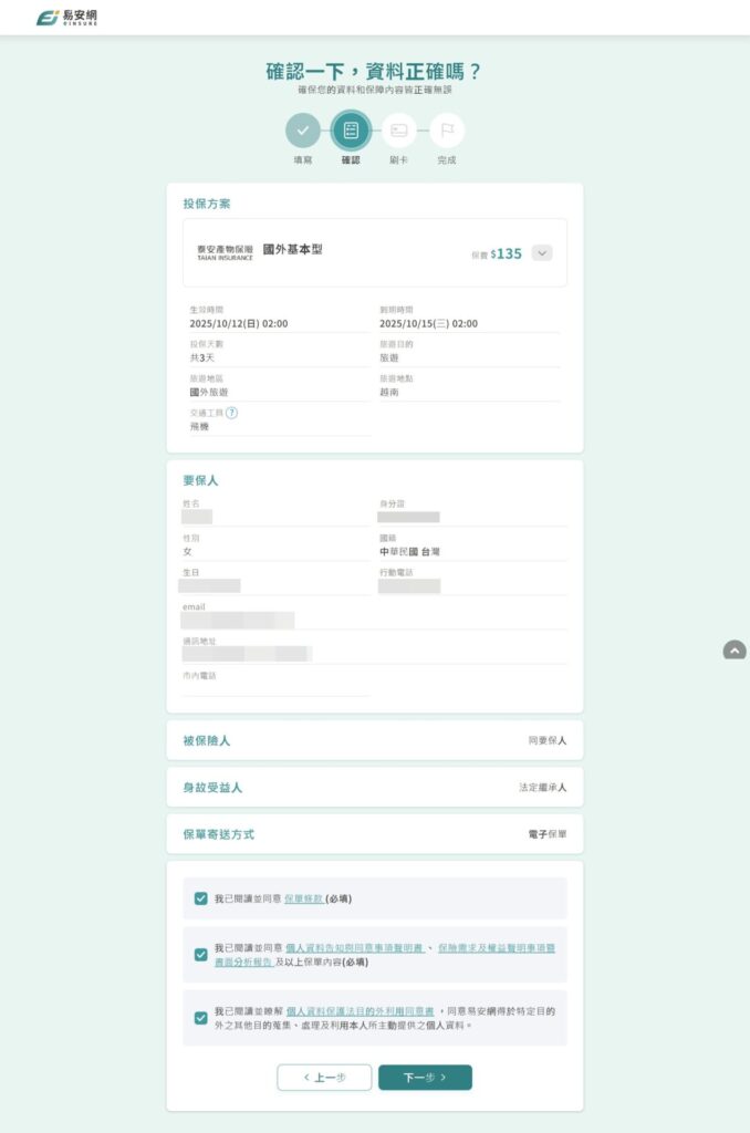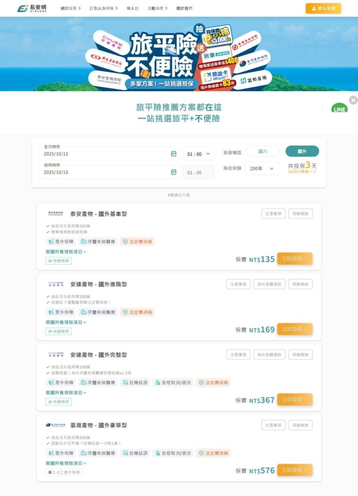 最近剛好要去越南河內,直接利用易安網投保,輸入旅遊日期(最少3天)、身故保額(最低200萬、最高1100萬),它就會把符合你需求的保險公司都列出來喔!最低一百多能買個保障