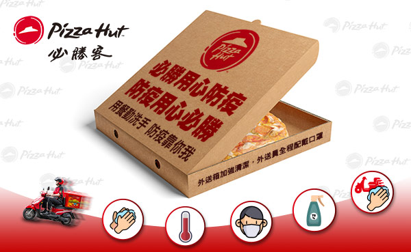 必勝客長期深耕外送比薩市場,全台擁有千位經專業訓練的外送員,以高標準嚴謹執行清潔作業及員工衛生健康管理。防疫期間,更啟動「安心送」防疫SOP:包含每日確實測量體溫不得超過37.5度,員工上班期間全程配戴口罩,門市每小時消毒相關烹調器具、菜單、自動門等,確保員工及消費者來店衛生安全: