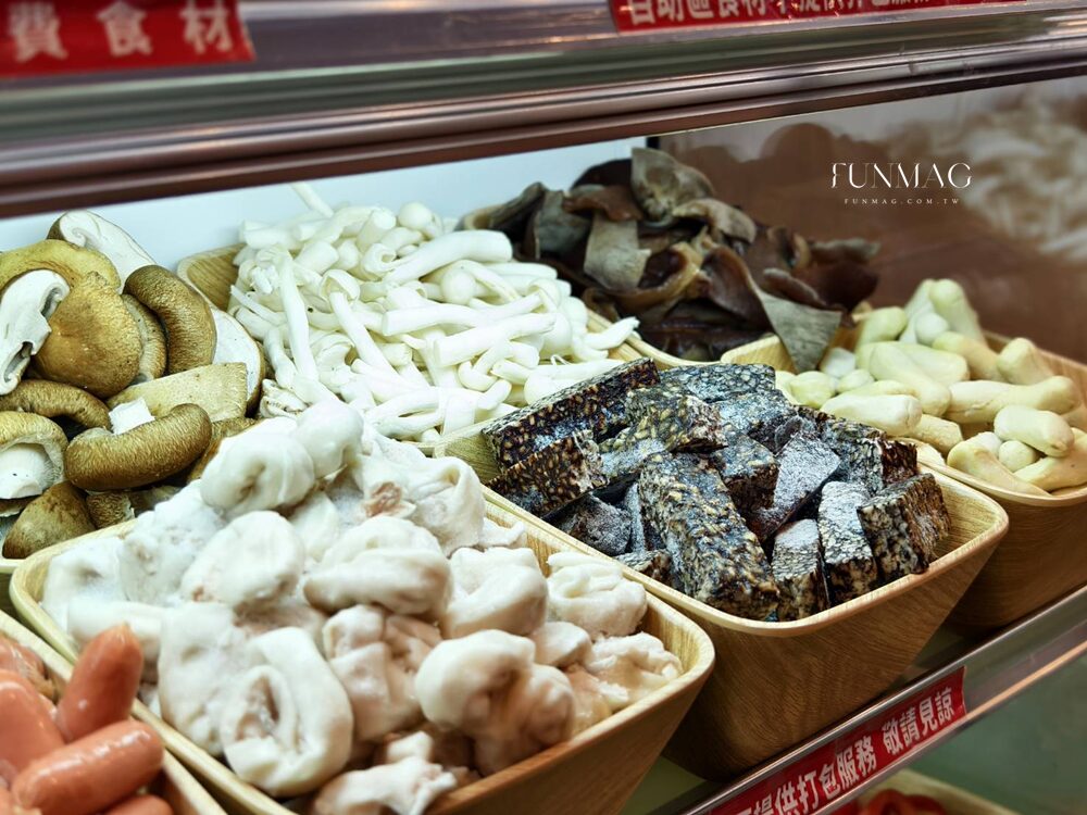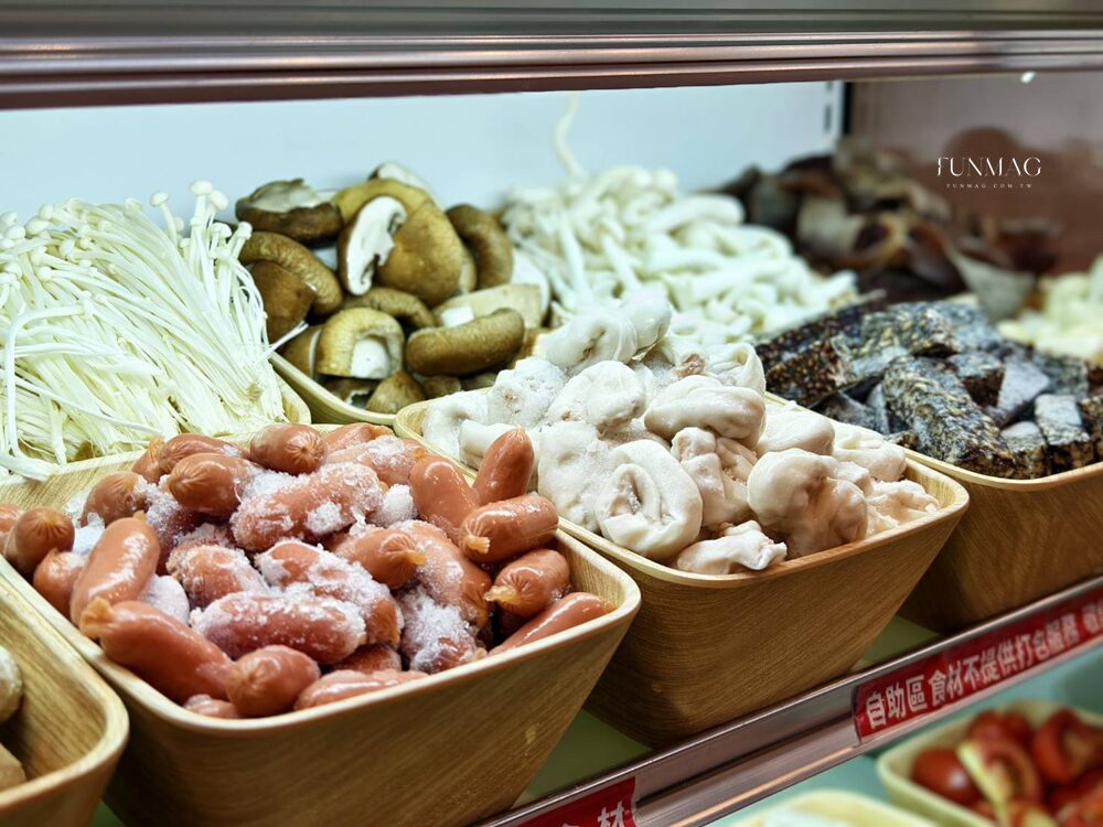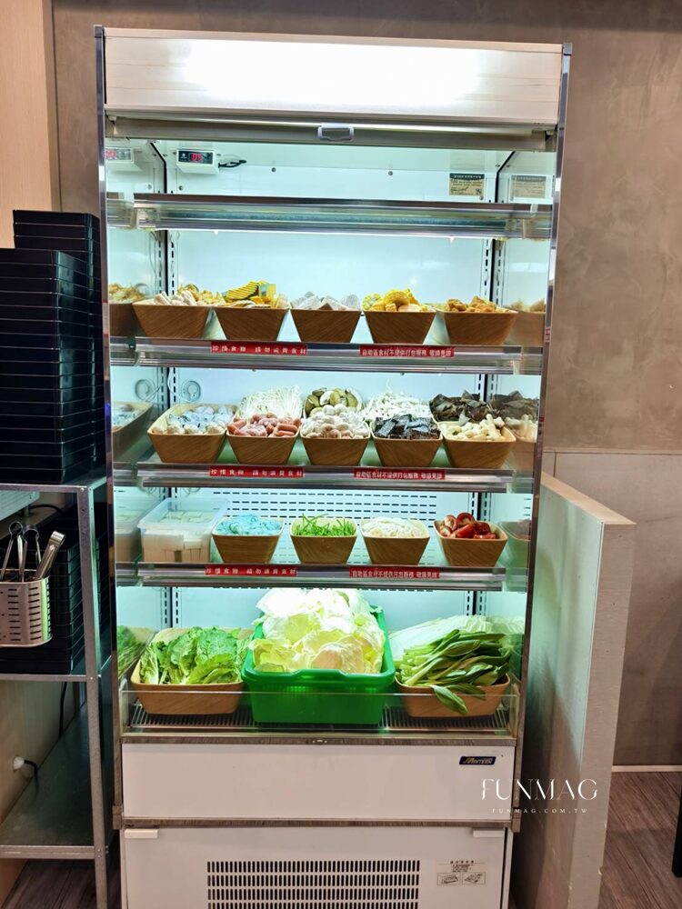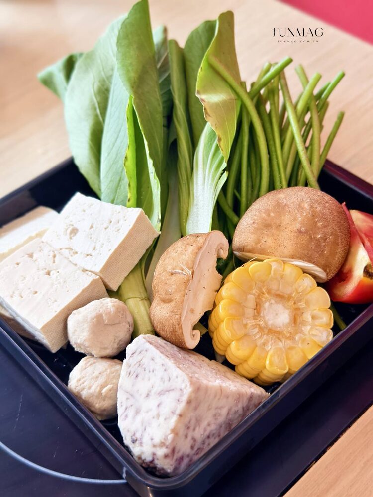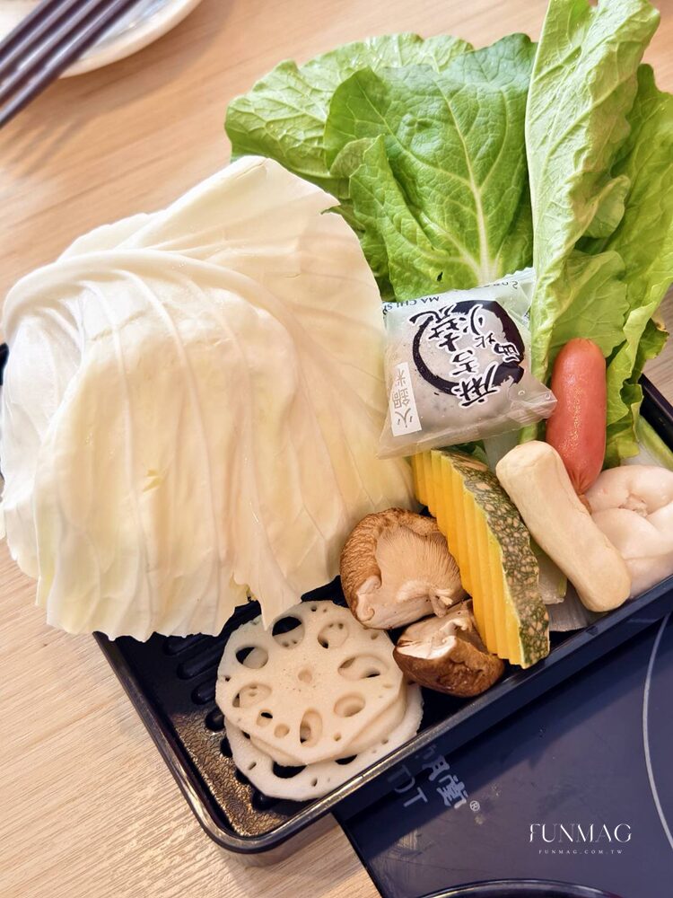 店家的菜盤採自助式,喜歡吃什麼自己夾,品項也不少,蔬菜、菇類、火鍋料都有,而且是可以吃到飽的喔!