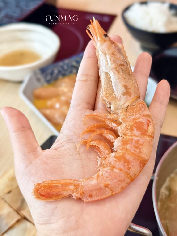 天使紅蝦跟手掌一樣大,它是屬於深海蝦種,活動力低,因此肉質鬆軟,有著濃厚的海味