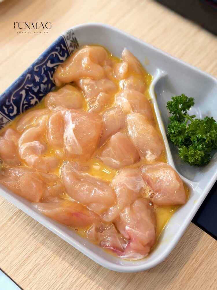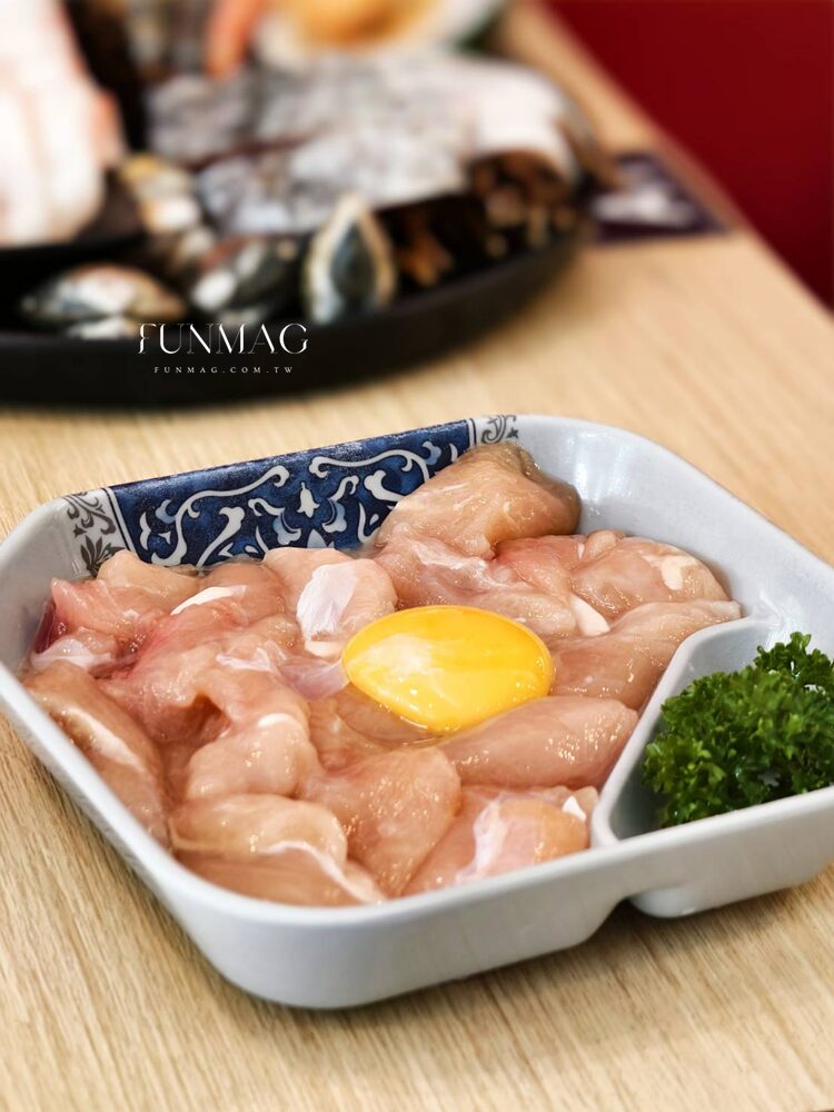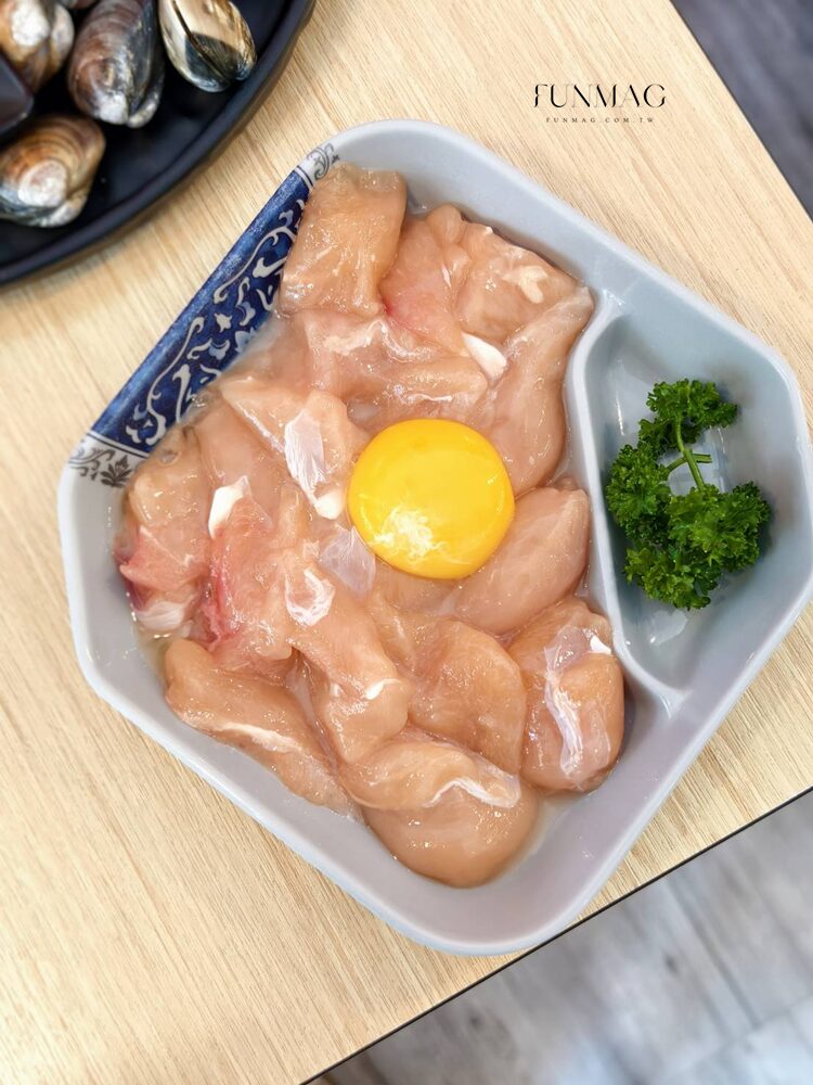 滿滿一盤的雞柳條打入一顆生食級蛋黃,也是一般火鍋店較少見的吃法,於利用蛋黃的滑潤與黏稠感,將雞柳條達到絲滑軟嫩的境界,而且有一層蛋液的保護,較耐煮,軟嫩度大幅提升