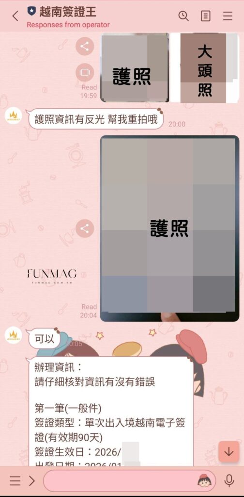 像這樣提供護照、6個月內的兩吋照片,然後付錢就好了,過程超快速,也很適合長輩自己辦,像護照有問題馬上告訴你,如果自己辦的話容易把反光的護照就上傳了,有人工幫忙審核更安心,接著客服會回你取件時間,取件時間到了就會發送到 LINE,列印出來即可使用